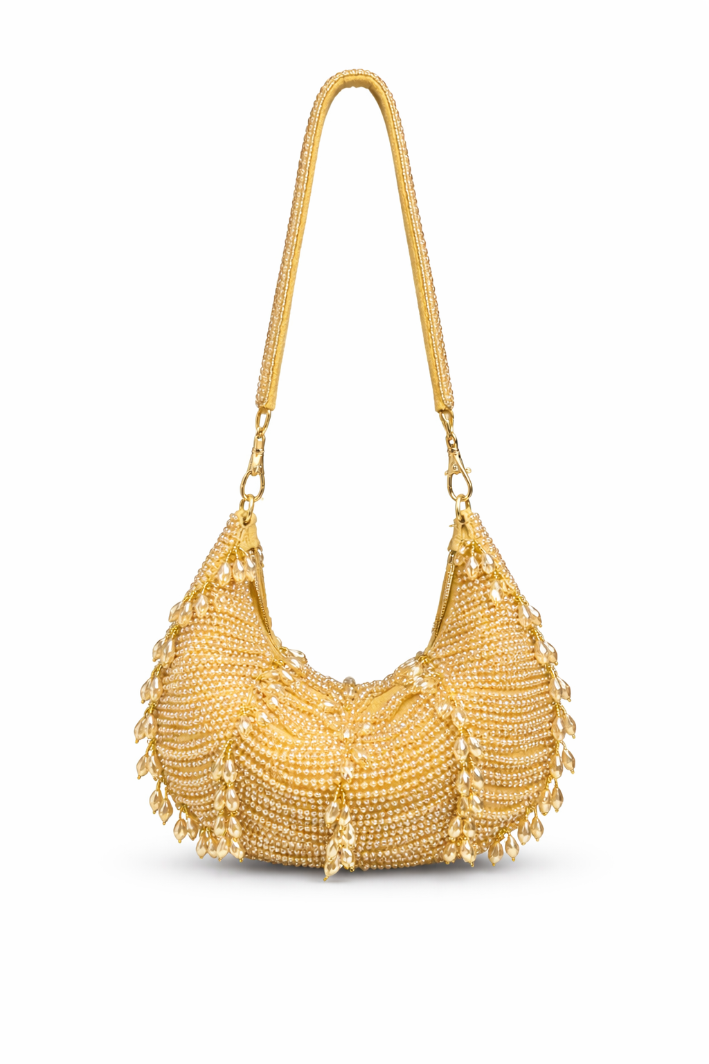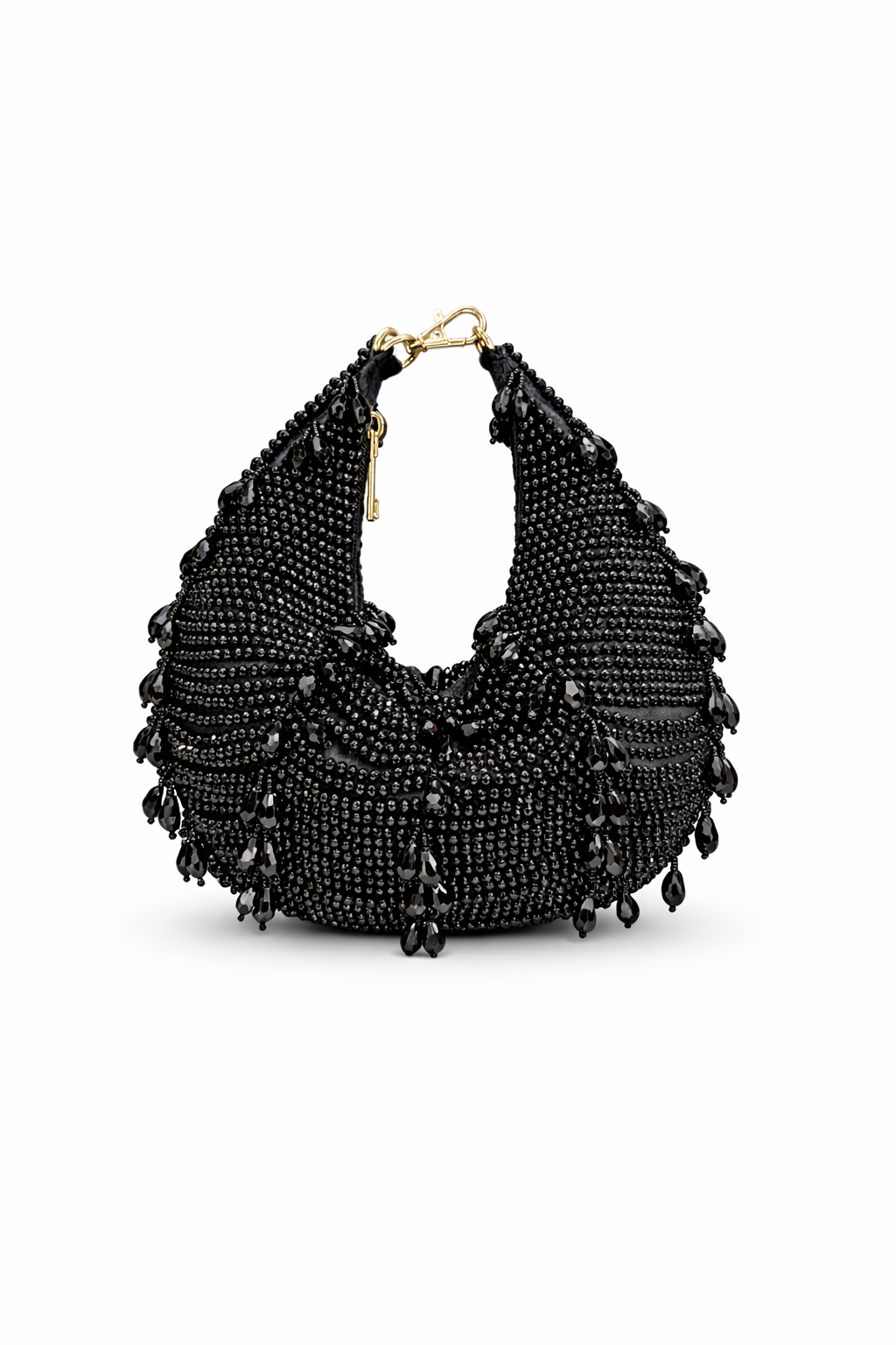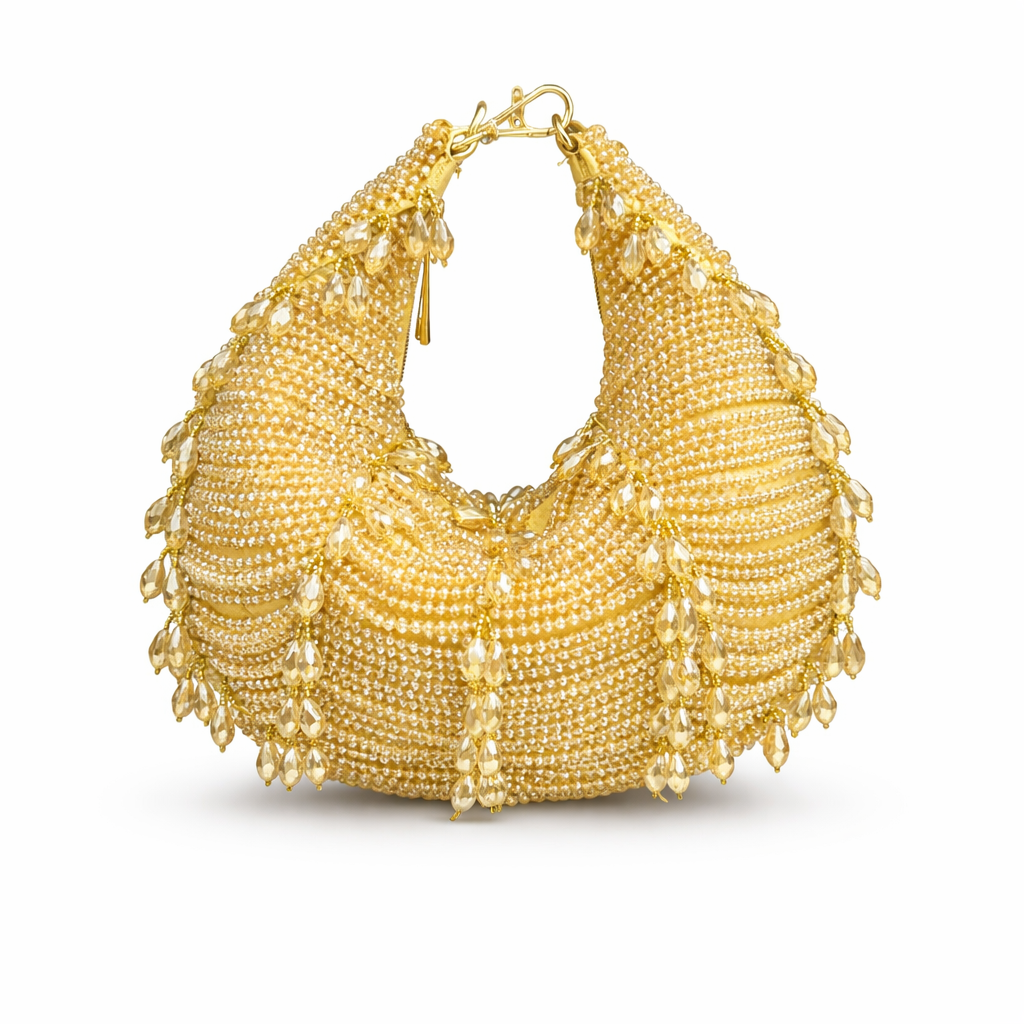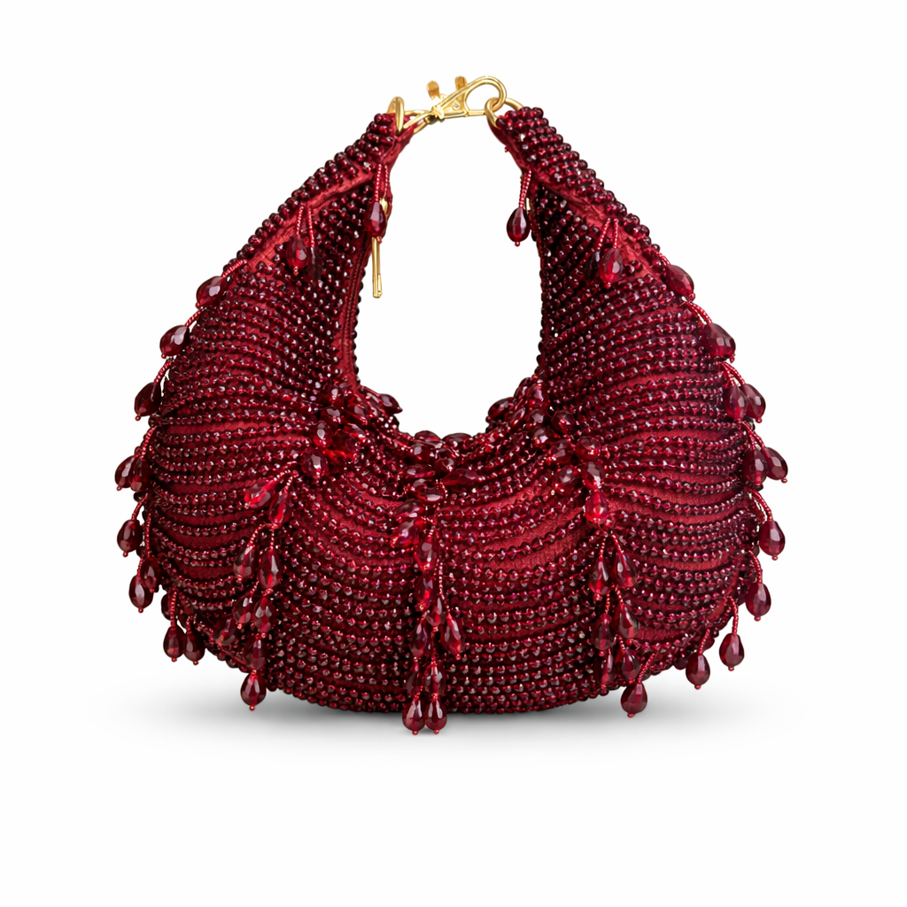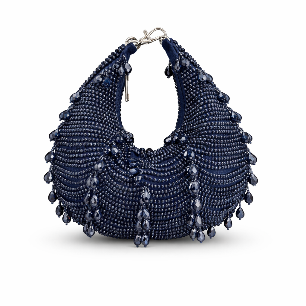 Make a bold and glamorous statement with this stunning emerald beaded handbag. Designed in a chic crescent silhouette, this piece is fully hand-embellished with finely placed deep green crystals that shimmer beautifully under light, creating a luxurious and eye-catching finish.
